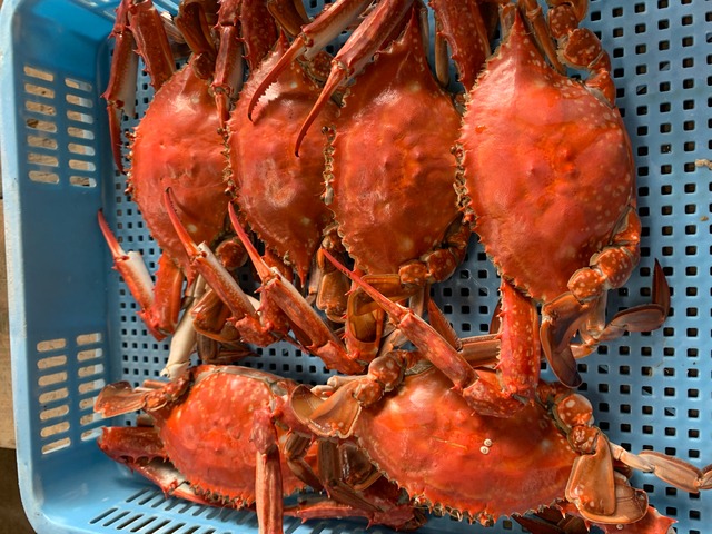愛知三河蒲郡は昔から湾の中で渡り蟹が水揚げされています。地元の漁師さんは水揚げ後セリまでの間に爪のハサミの上部をカットします。(カニ同士がけんかしないため、仲買さんが搬送中に挟まれてケガをしないため。)1尾づつ丁寧に扱ってます。 旬の渡り蟹は身のつまりもよくおすすめの季節です。 ご注文を頂いてから生きたものを水槽から出して塩ゆでします。 活きたものを茹でるのは身の締まりも格段よく、冷凍とも違いおいしいと自信を持ってます。その日の内に発送して翌日(一部地域を除く)お手元に届きます。 今回は大ぶりの物を2尾発送いたします。