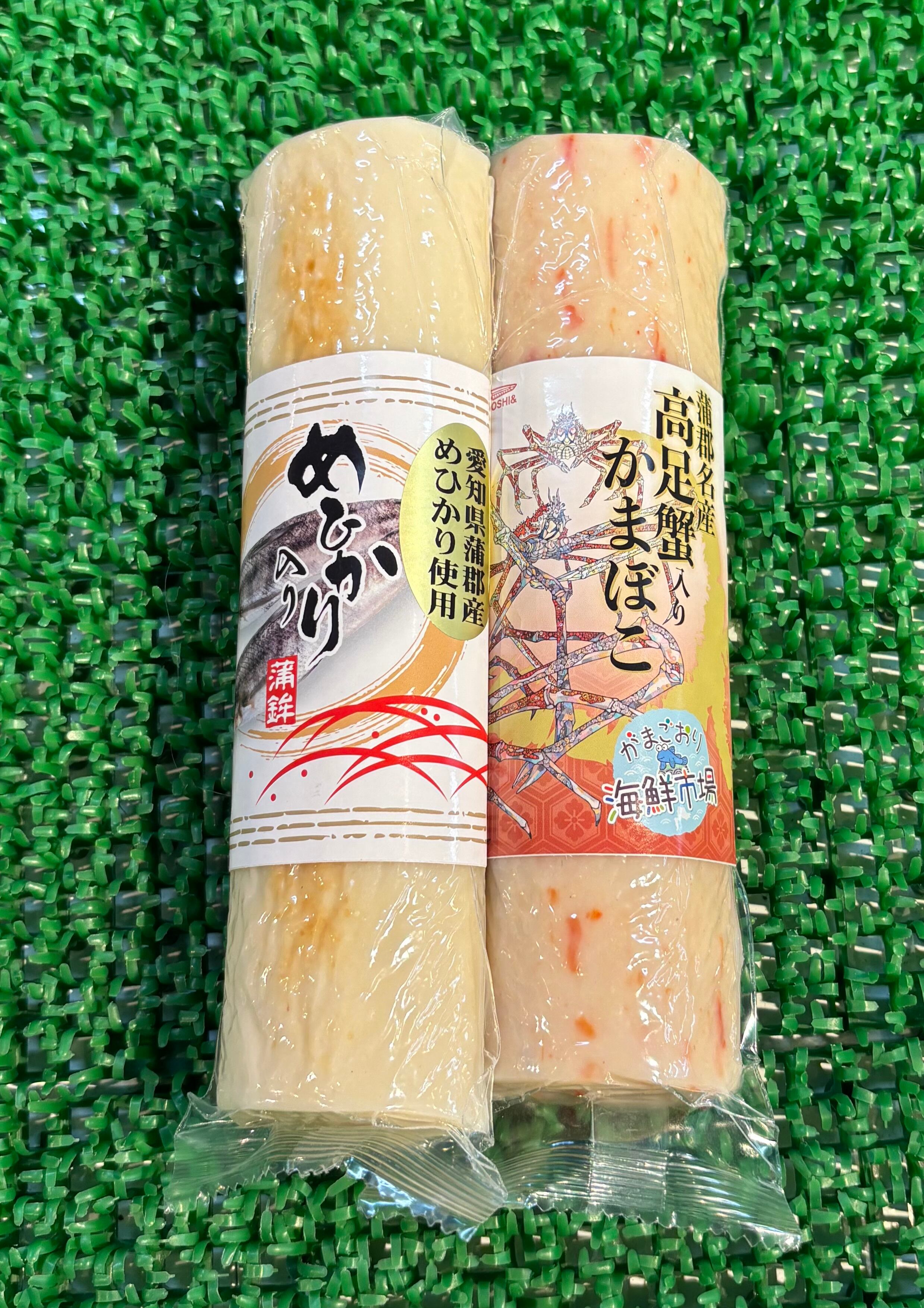 蒲郡産の深海のタカアシガニを剥き身にして魚のすり身と成形し蒸したこだわりの蒲鉾と、蒲郡産のめひかりを頭取内臓取りをして、魚のすり身と合わせ蒸しあげた蒲鉾セット、どちらも当店のオリジナル商品の為ここでしかネット購入できません。(後は店頭にご来店でお求めできます。)