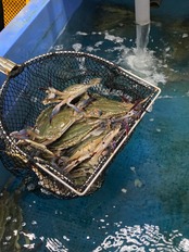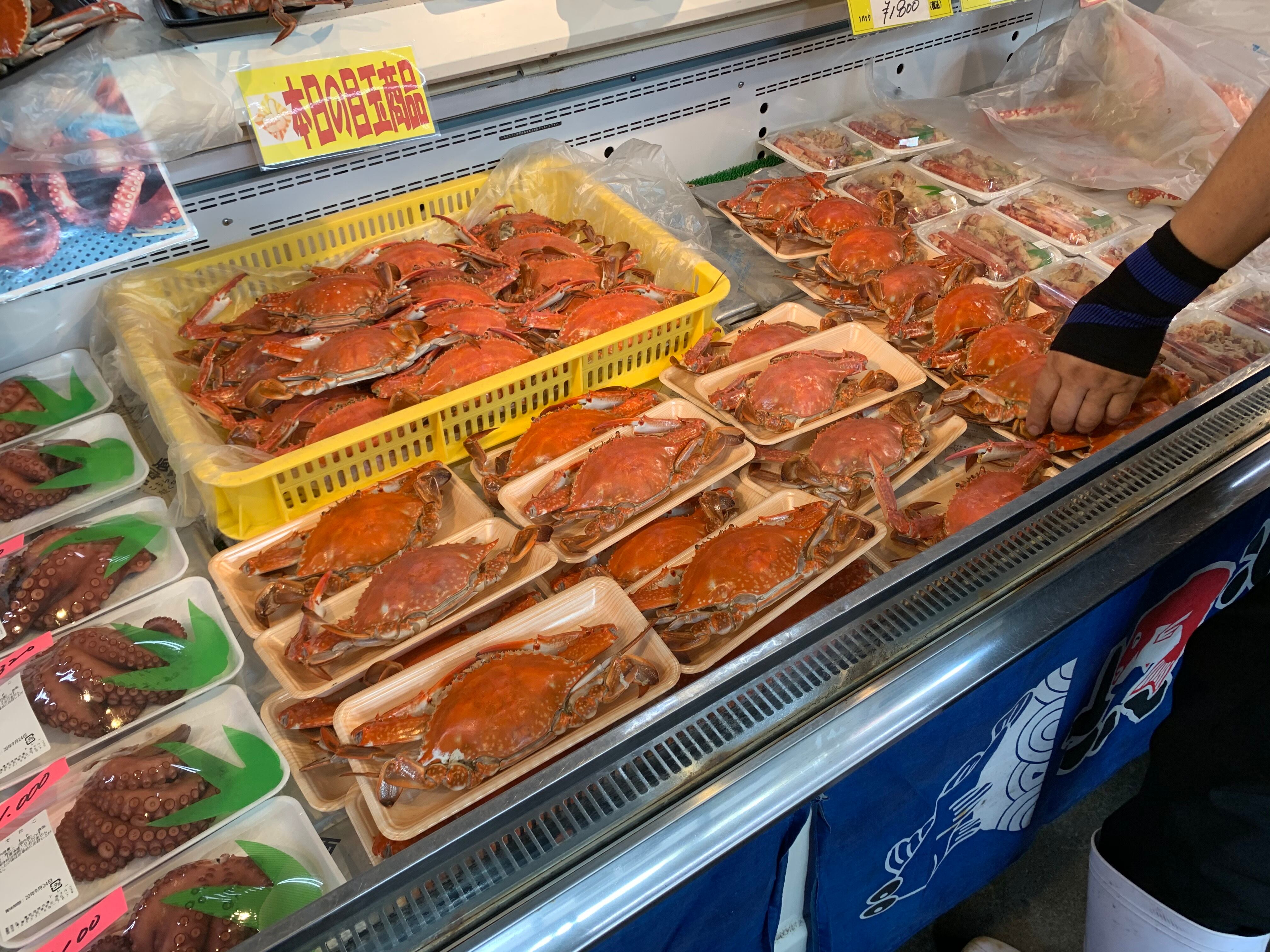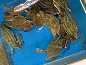 愛知三河蒲郡は昔から湾の中で渡り蟹が水揚げされています。地元の漁師さんは水揚げ後セリまでの間に爪のハサミの上部をカットします。(カニ同士がけんかしないため、仲買さんが搬送中に挟まれてケガをしないため。)1尾づつ丁寧に扱ってます。